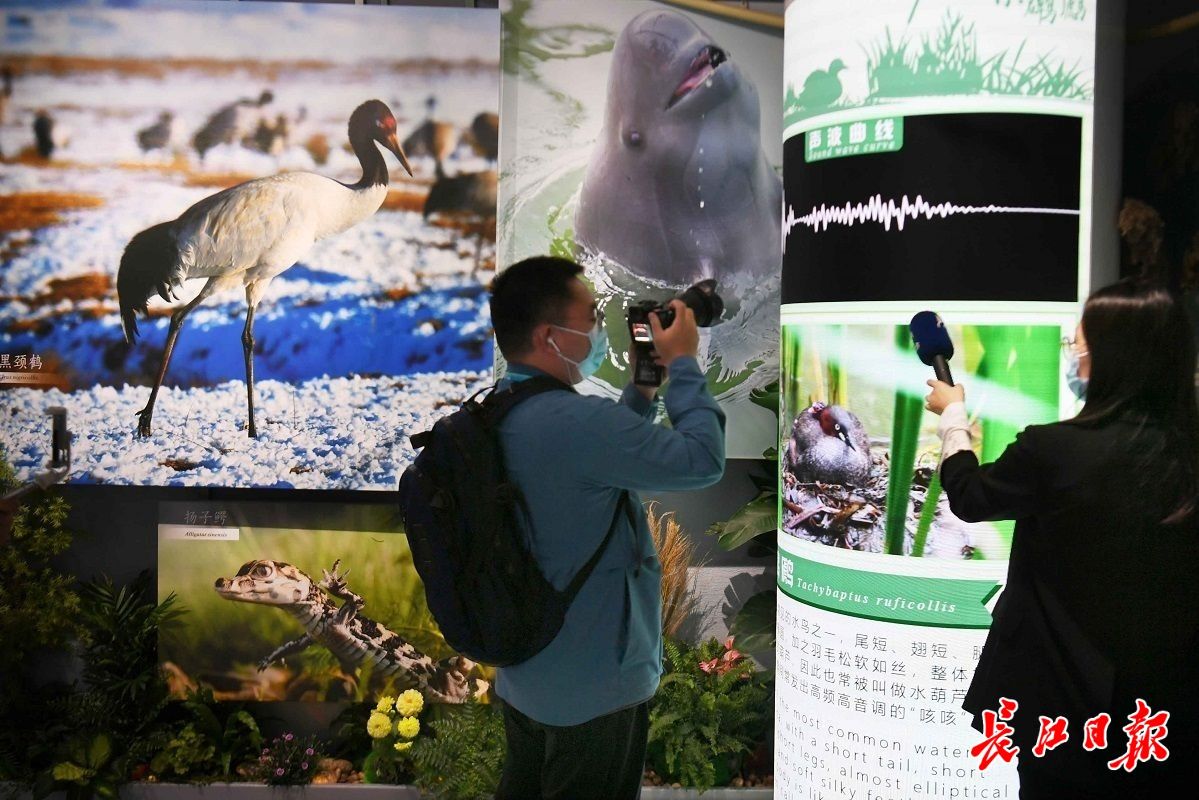 媒体记者在拍摄中国履行《湿地公约》30周年成就展。
