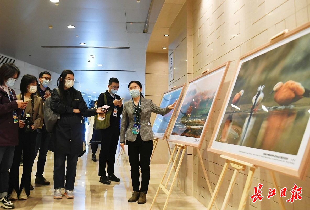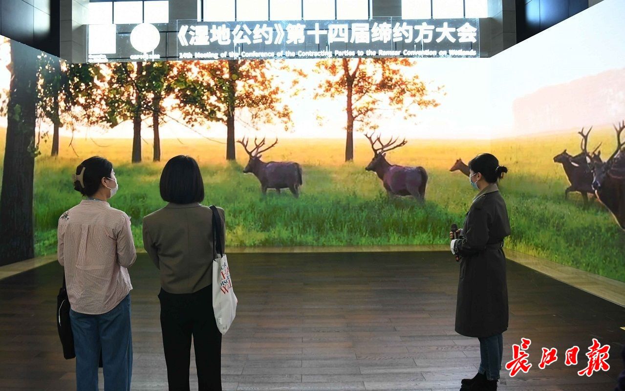 记者在湿地大会媒体中心观看《大美湿地摄影展》。