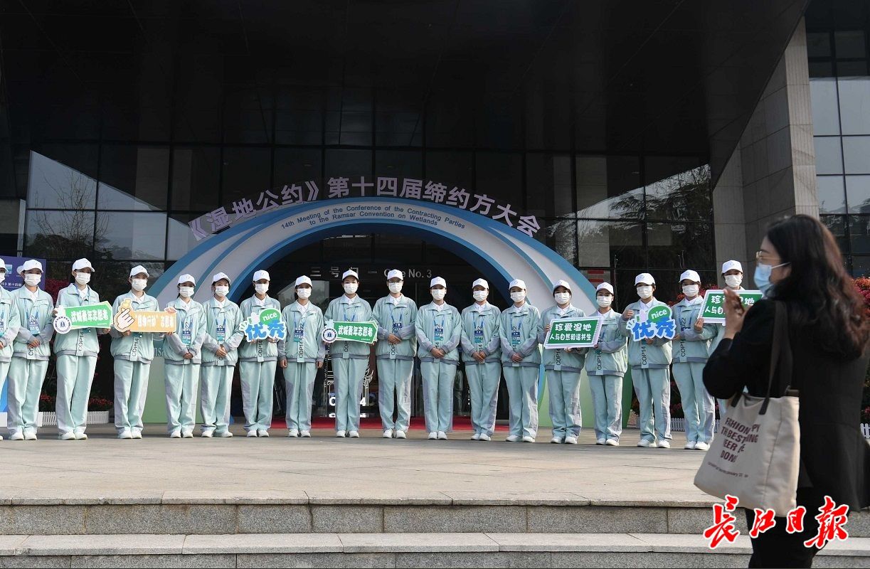 记者在湿地大会媒体中心为大会自愿者拍照。