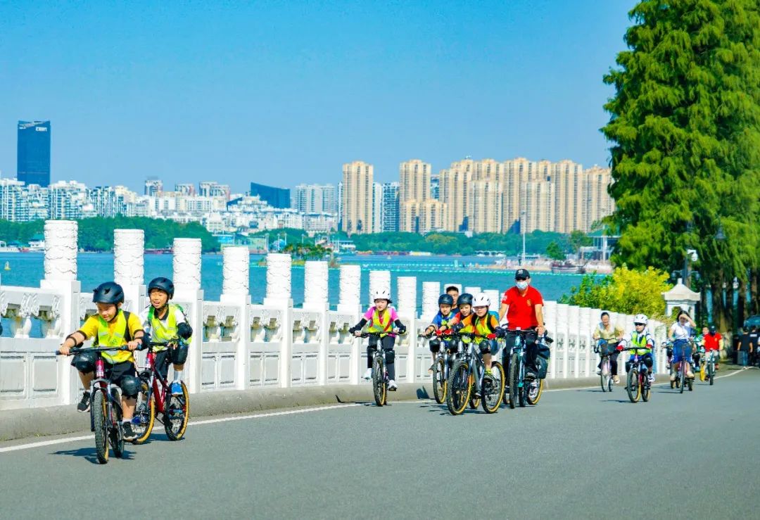 孩子们在老师的带领下用骑行的方式探索绿道。