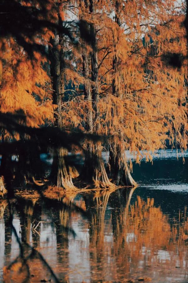 记者了解到,此地位于东湖磨山景区附近的磨山揽翠。由磨山揽翠牌坊进入,沿柏油路一直向前走,经过文艺范儿十足的杉美术馆路口后,会看到左手边一条未修好的土路,步行穿过,即可望见大片邻水生长的杉树林。12月的杉树林已全部染上红的、黄的色彩,水面上的倒影与之相映成趣,宛若童话世界。“在城市中心就能抵达的原生态杉树林,景色不可多得。”摄影师马丁在水杉林间拍下了诸多影像,有的聚焦夕阳下的杉树剪影,有的聚焦盘踞在土地上的气根,有的聚焦光影婆娑的杉树叶,有的则聚焦水中倒影,“我把这里称作‘魔法森林’”。