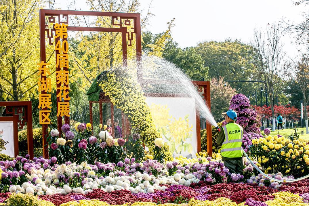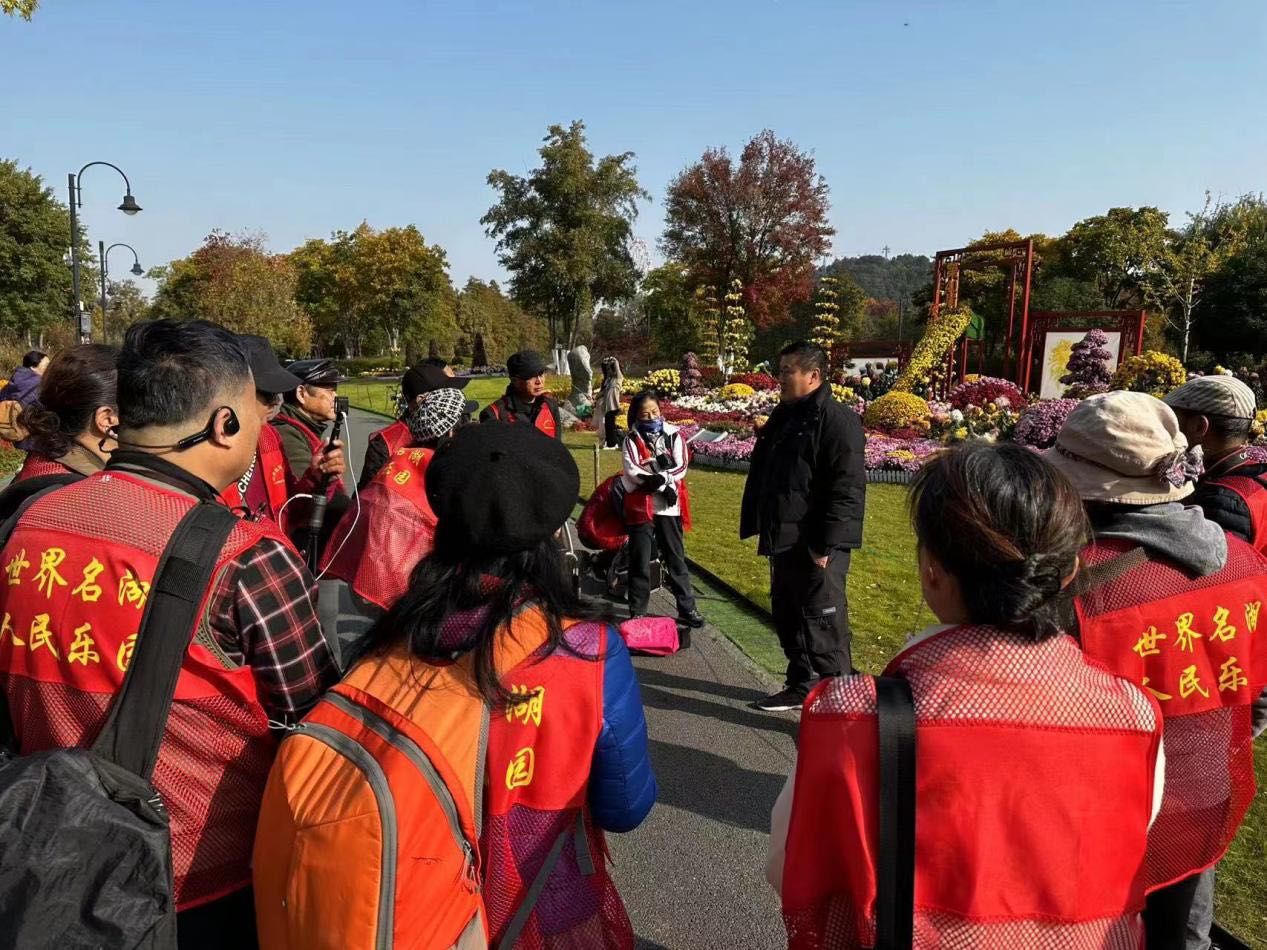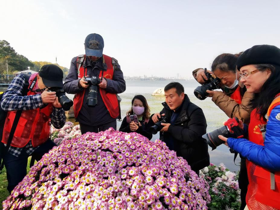 11月24日上午,在东湖磨山景区全景广场——武汉市金秋菊展东湖展区前,参加活动的近20位摄影爱好者,在影像大咖刘巍老师的带领下,正在现场寻找拍出独特菊展影像的角度。