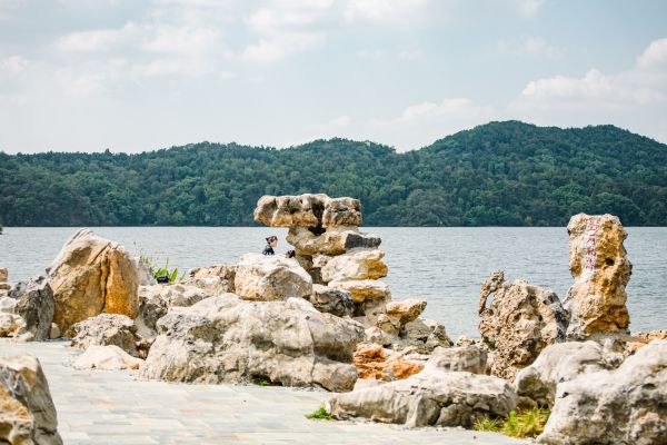 游客小宁在叠石观涛景点前排队拍照,巨石堆砌起来的石洞像个天然相框,透过石洞的湖面波光粼粼,她介绍道,“这个点位是最‘火’的,今天终于来拍了,虽然太阳很大,拍得这么美也值了!”