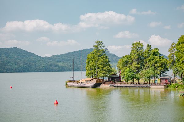 良古湖边餐厅坐落于落雁景区,凭借一线临湖露台,开阔的四季美景吸引众多年轻人在此举办户外婚礼。傍晚时分,天空是层层晕染的粉紫色,落日照耀得湖面波光粼粼,微风轻柔,为婚礼增添几分浪漫。