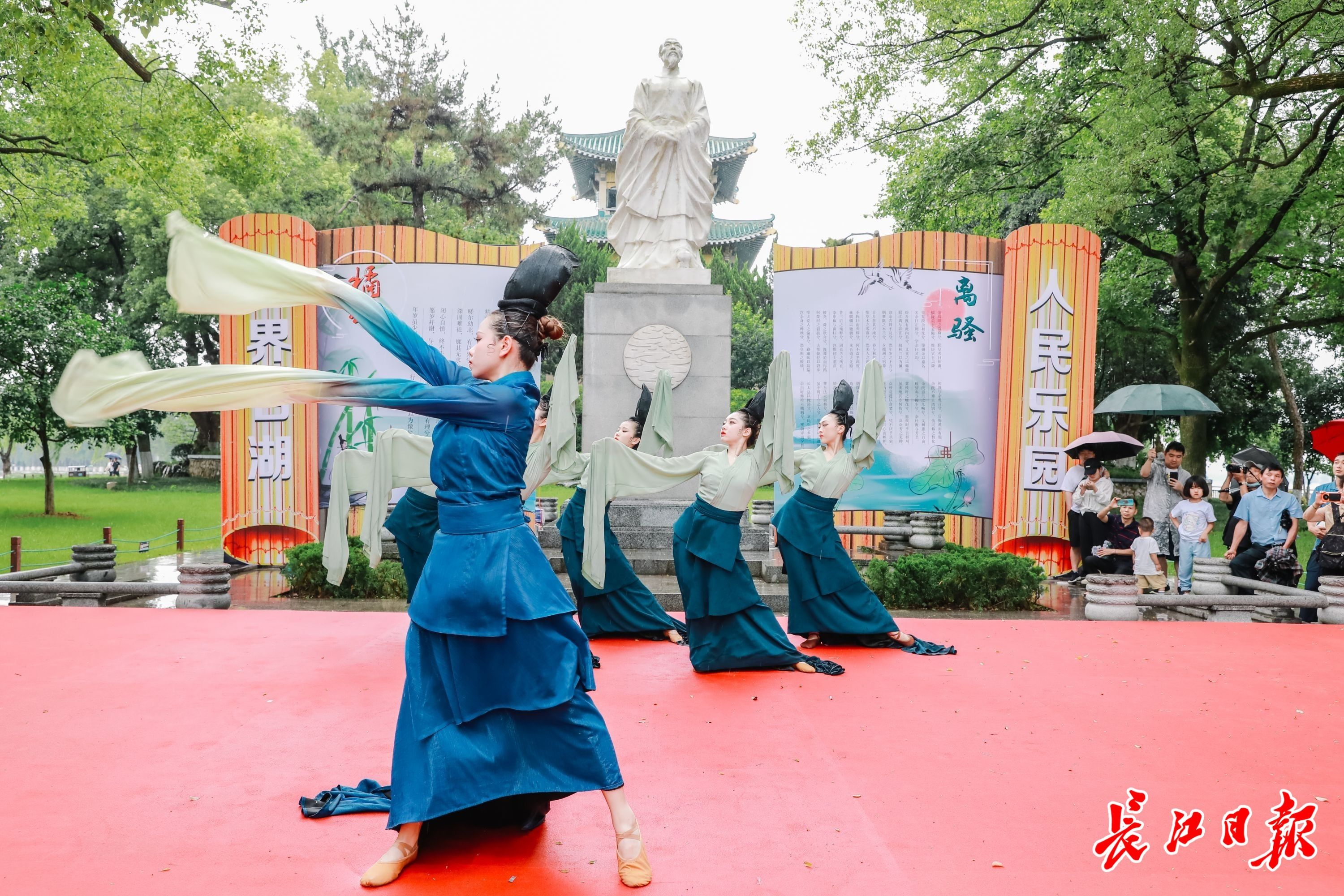 琵琶古筝声声入耳,身着汉服的民乐乐手先后演奏了瑰丽浪漫的《楚辞》和婉转绵长的《高山流水》,赢得了游客满堂喝彩。身着青绿长裙、头顶山峰发髻的少女翩翩起舞,与行吟阁的圆柱绿瓦、远端的山峦和谐相融,《苍山点翠》、东湖版《只此青绿》、《千里江山图》等古典舞演员舞姿翩跹。
