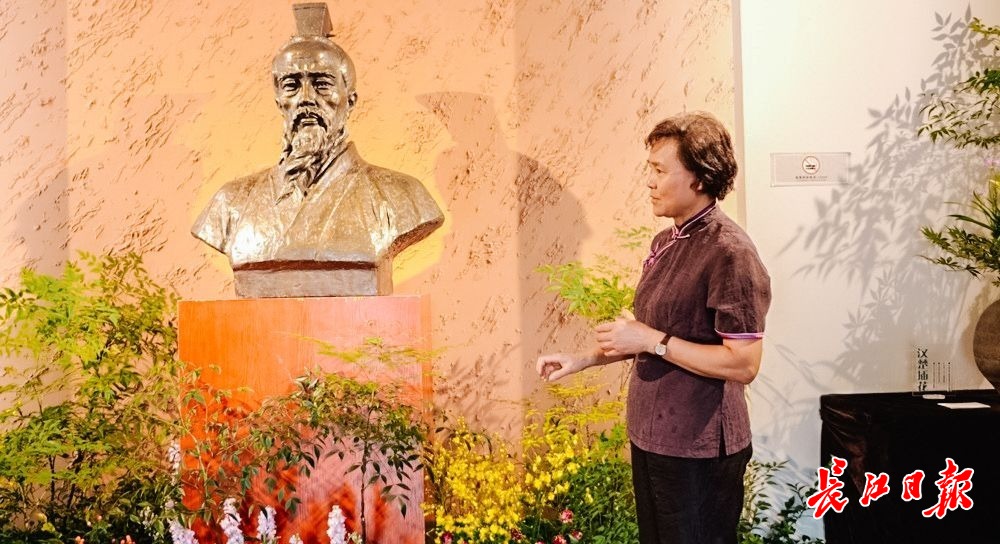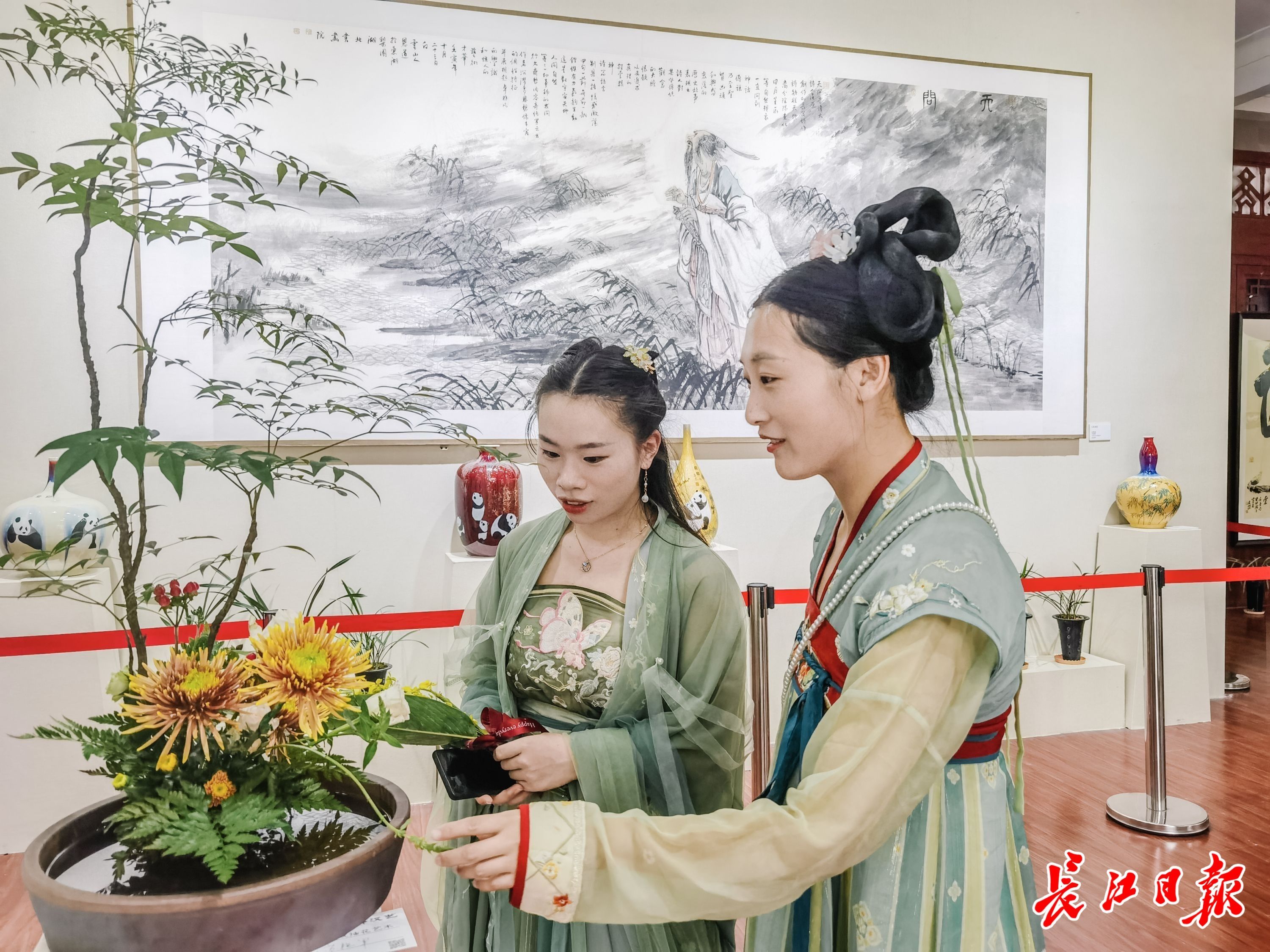 “屈原曾在楚辞中写到‘扈江离与辟芷兮,纫秋兰以为佩’,说明从那时起古人就有赏花、习花、佩花的习惯。”非遗项目汉楚传统插花艺术的代表性传承人苏艳玲以楚辞为依据,用花草植物制作了一系列插花作品和人体花饰,她告诉记者,“汉楚插花艺术是中国插花艺术的一部分,至今有400多年历史,本次展览采用了汉楚地域特色的植物、树材花卉和器皿,讲述了兼备人文特质和花卉自然之美的东湖故事。”