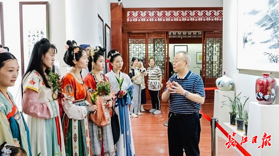 家住黄石的李女士专程带女儿来听涛“过”端午,身着汉服的母女俩在汉楚插花前合影留念。“穿上汉服过端午,更有韵味。”李女士告诉记者,“端午节是中国传统节日,听涛景区的民俗活动、书画展览好玩又好看,寓教于乐,孩子也能从中学习到原汁原味的中华传统文化。”
