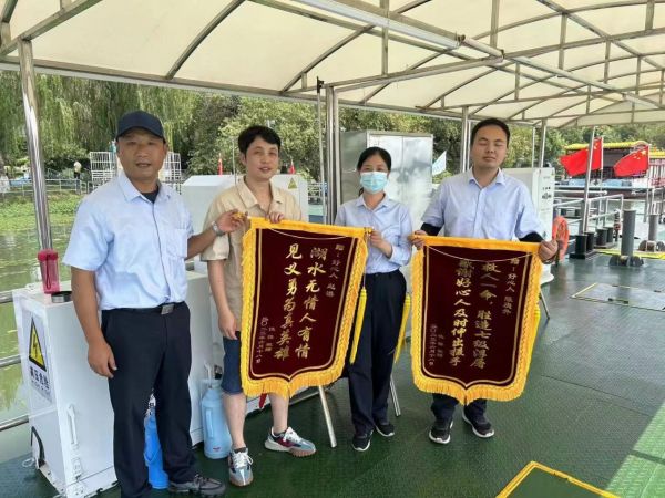 30分钟后,游船行驶至“行吟阁”水域附近,湖面传来的呼救声引起了陈庚升的注意,确认有人溺水后,陈庚升果断地根据落水营救紧急处理预案停下了船,迅速锁定落水者位置并向公司及海事报告情况。