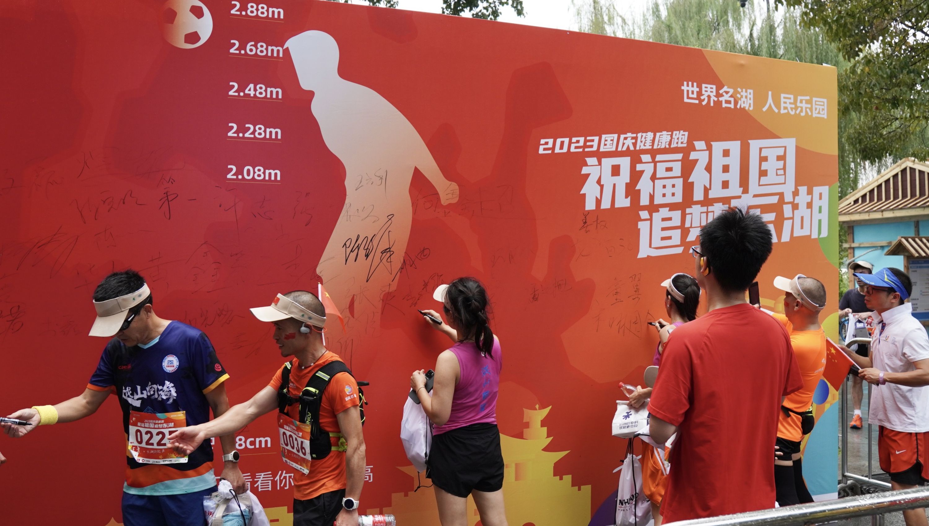 跑友健康向前的姿态引起众多市民游客的共情,现场不时传来“国庆快乐,加油奔跑”的欢呼声。绿道上“祝福祖国 追梦东湖”打卡点也吸引了众多游客停下脚步拍照留念,加入这场“祝福祖国 追梦东湖”的行动中来。