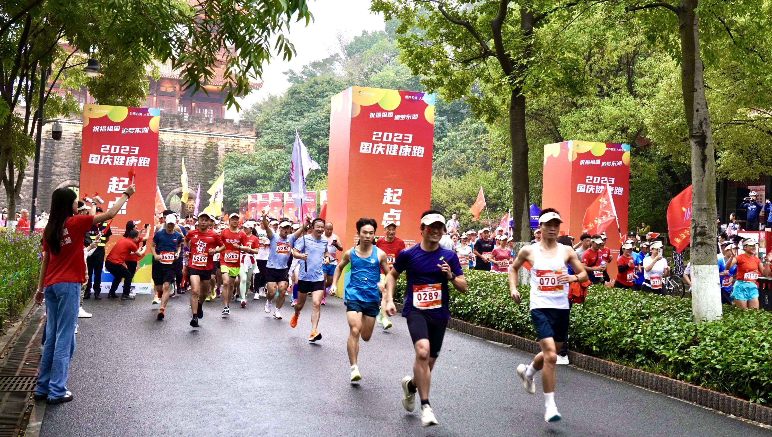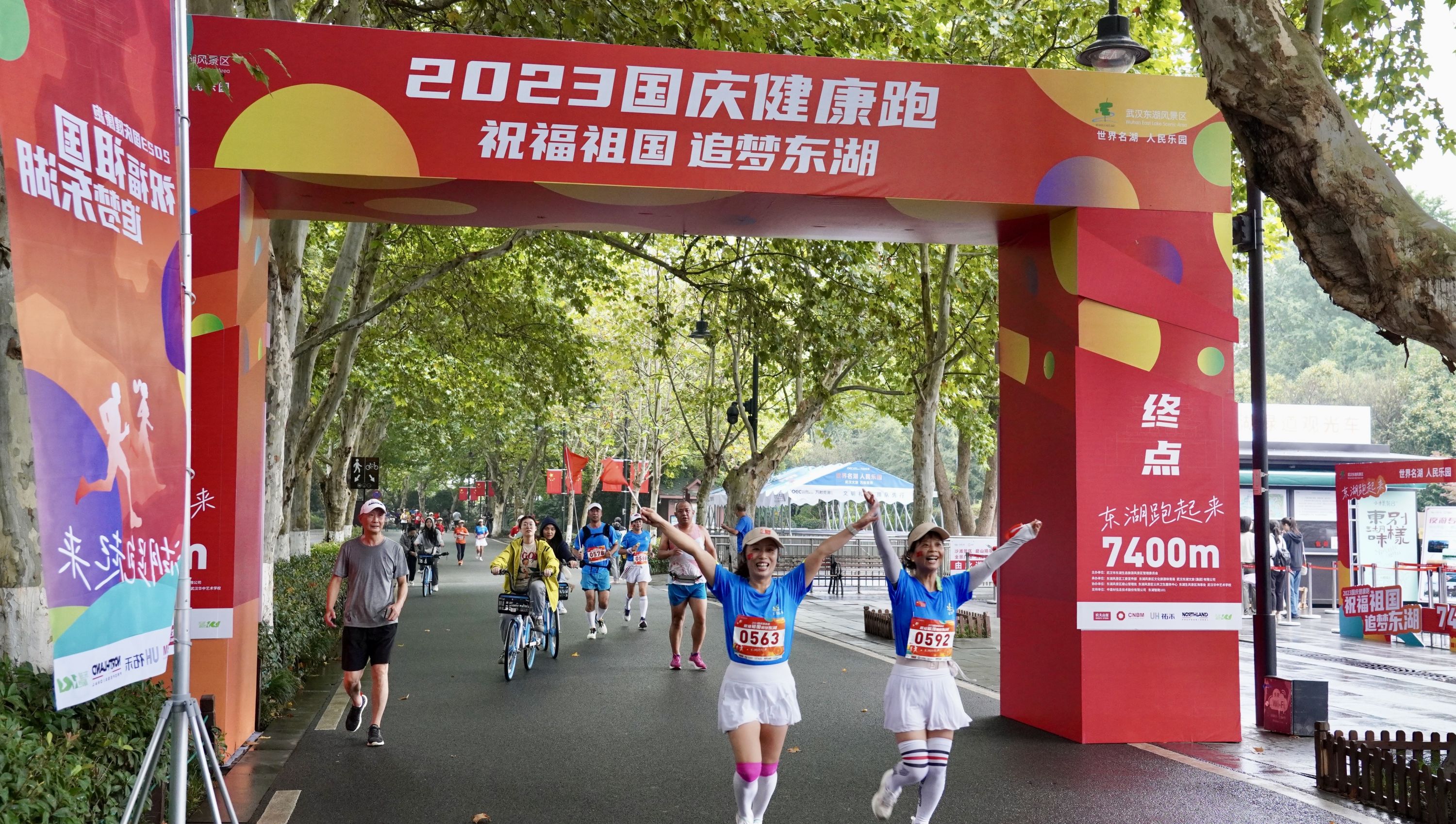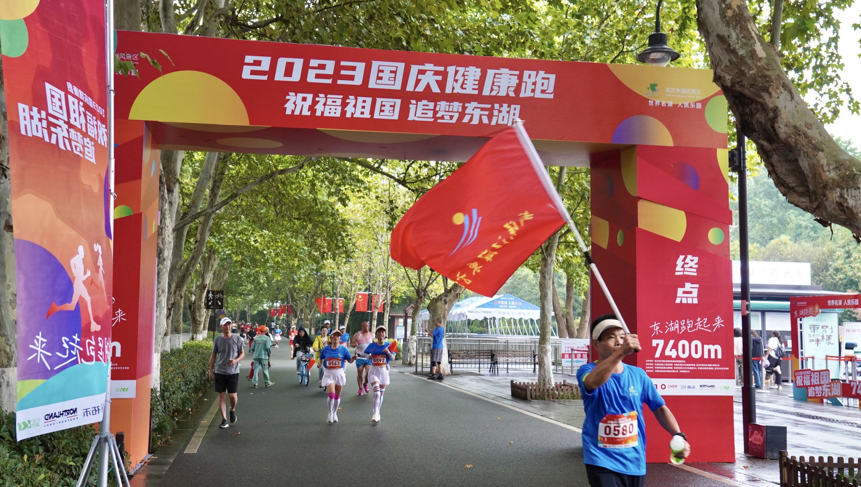 五星红旗乘着无人机在东湖高空飘扬,各地跑友沿智慧跑道开启健康跑……10月1日,“祝福祖国 追梦东湖”2023国庆健康跑活动在东湖风景区举行,广大市民游客畅游世界名湖、人民乐园,向祖国表白,充满热烈、祥和、喜庆的节日氛围。
