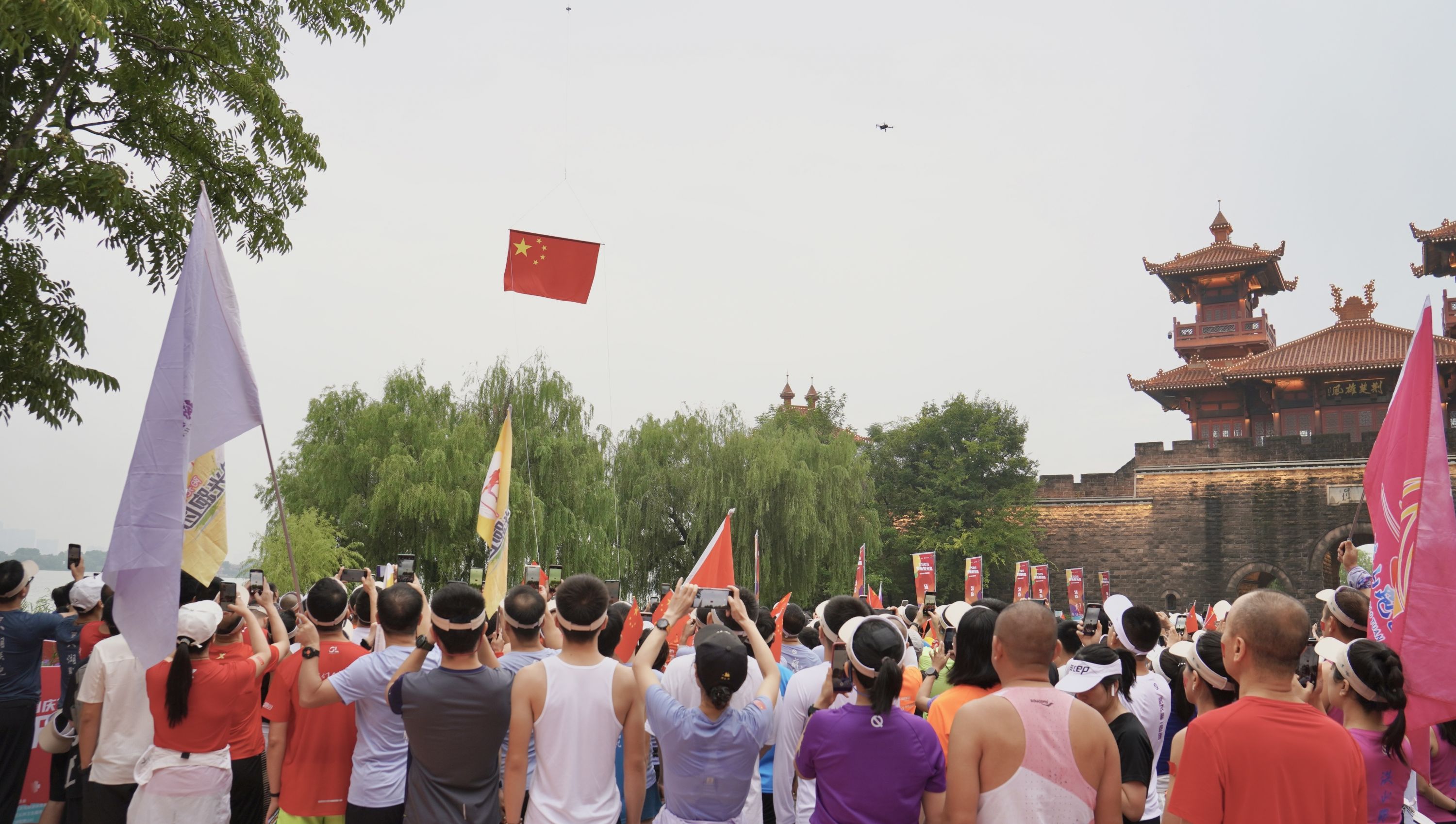 10月1日一大早,来自全国各地的近千名跑友齐聚东湖磨山脚下。伴随嘹亮、庄重的国歌声响起,跑友从磨山楚城欢乐开跑。与此同时,无人飞行器搭载着一面宽3米,高2米的五星红旗迎着曙光冉冉升起,承载着大家心中的美好祝愿飘扬在东湖高空上,奔跑的身影向迎风飘扬的国旗致敬。鲜艳夺目的红旗与东湖的秀美山水交相辉映,引得现场市民游客一片欢呼。