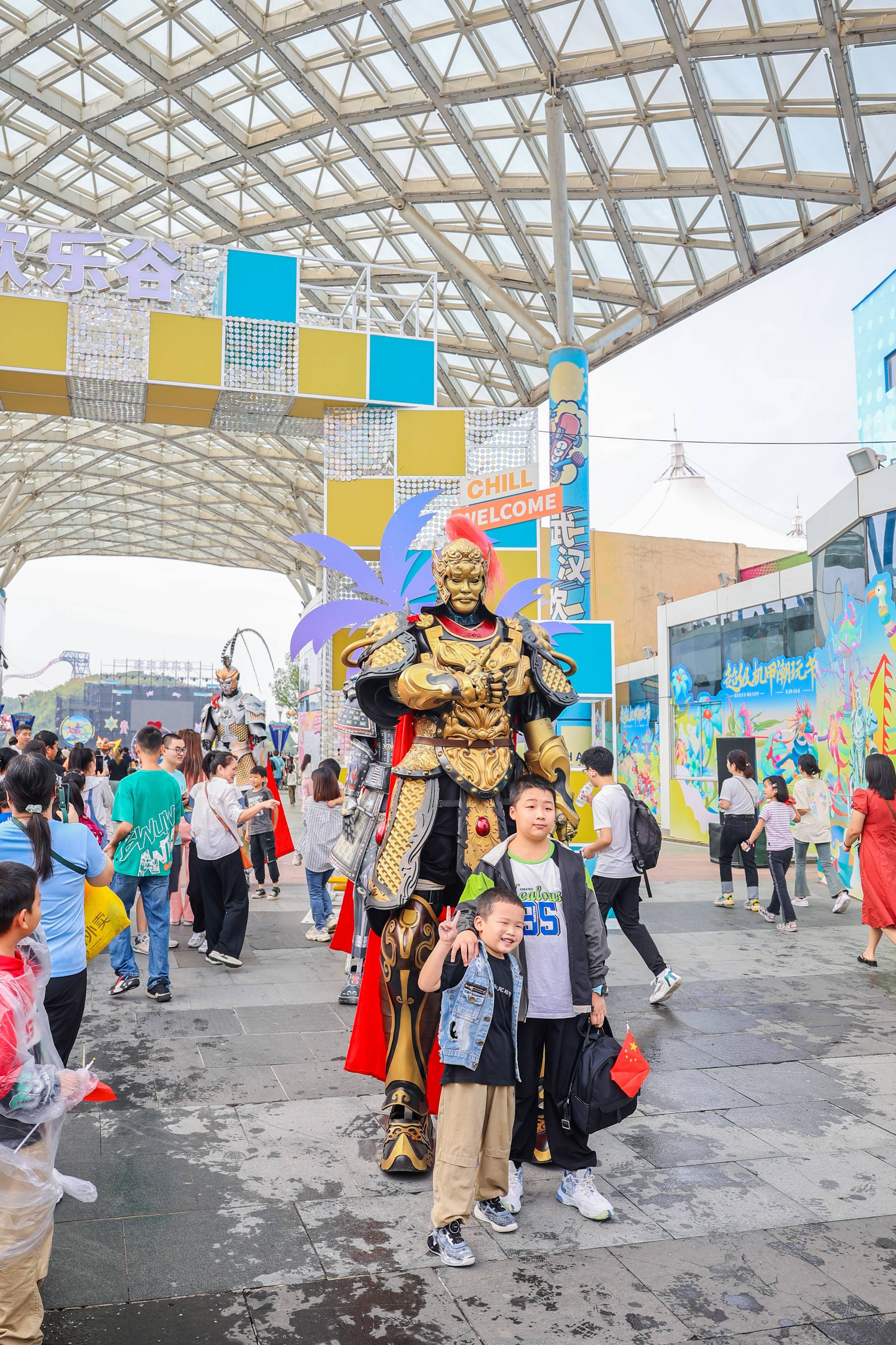 在武汉欢乐谷祝福墙,游客们拍下自己的微笑照片,拼出“我爱中国”字样,450张笑脸汇聚满满爱国情,热闹喜庆的国庆节氛围浓厚。当天,4.2米擎天巨牛惊艳亮相,顶天立地的红色钢铁巨牛喷云吐雾,如同脚踏祥云,不少游客一边拍摄一边赞叹擎天巨牛的壮观。国风机甲动能机械秀也惊艳登场,“常胜将军”“二郎神杨戬”“飞虎金刚”等多个国风英雄集结,仿真动态自主交互,与游客亲切地打招呼合影,让人近距离感受国风机甲的神奇魅力。