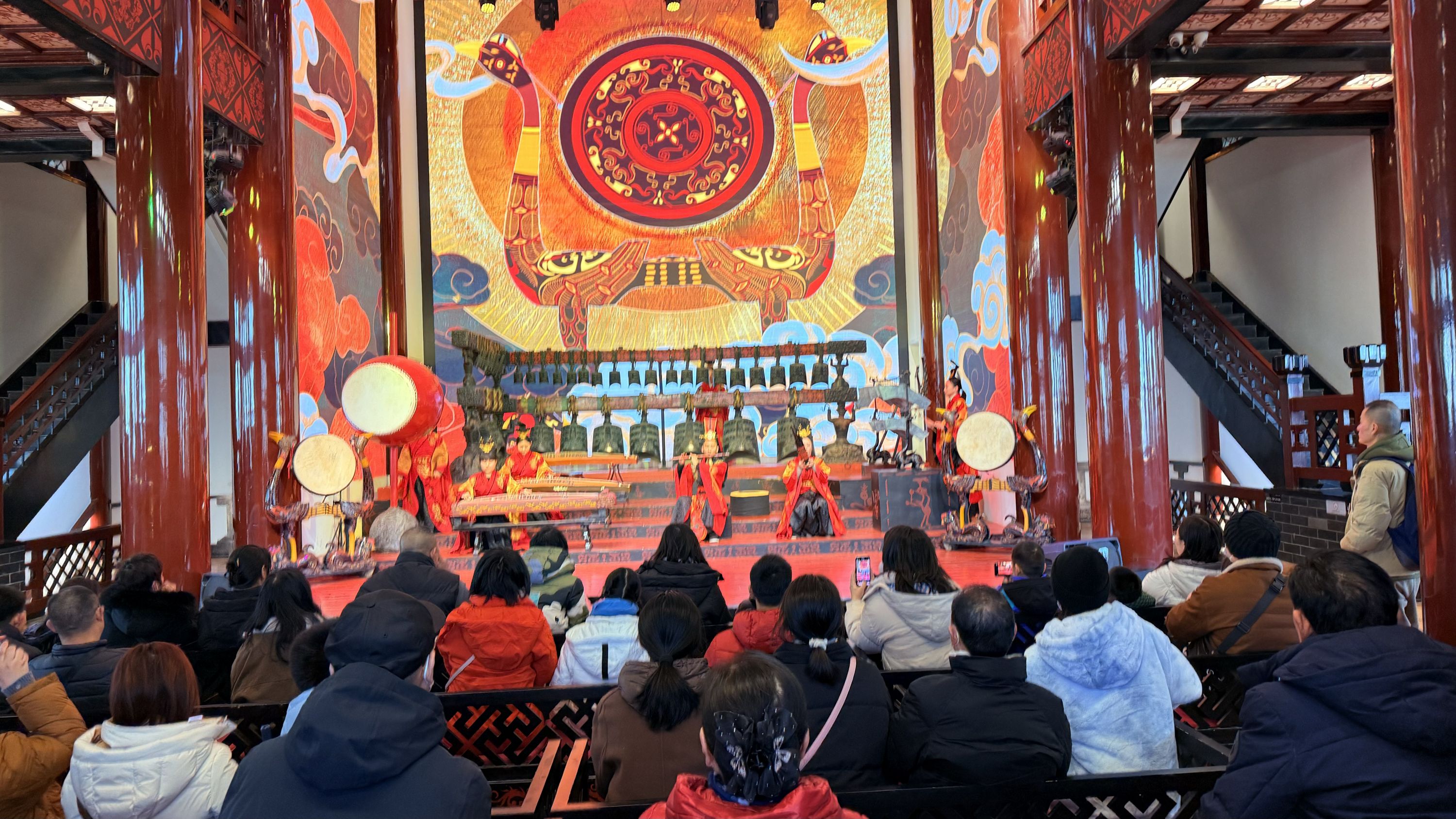 “除夕看了武汉分会场的短片后被震撼到,今天就和家人来武汉逛逛。”来自广州的游客马振邦专程和家人来磨山欣赏编钟古乐表演,步入楚天台,眼前的画面让他们惊喜,在外五层内六层的楚天台中,他们欣赏了大气磅礴的编钟乐舞表演,并在精致的展柜中观赏到了颇具“楚味”的漆木器、青铜器等。在全新升级的展馆中,他们还在一幅幅精致的墙画上欣赏到楚文化的璀璨。