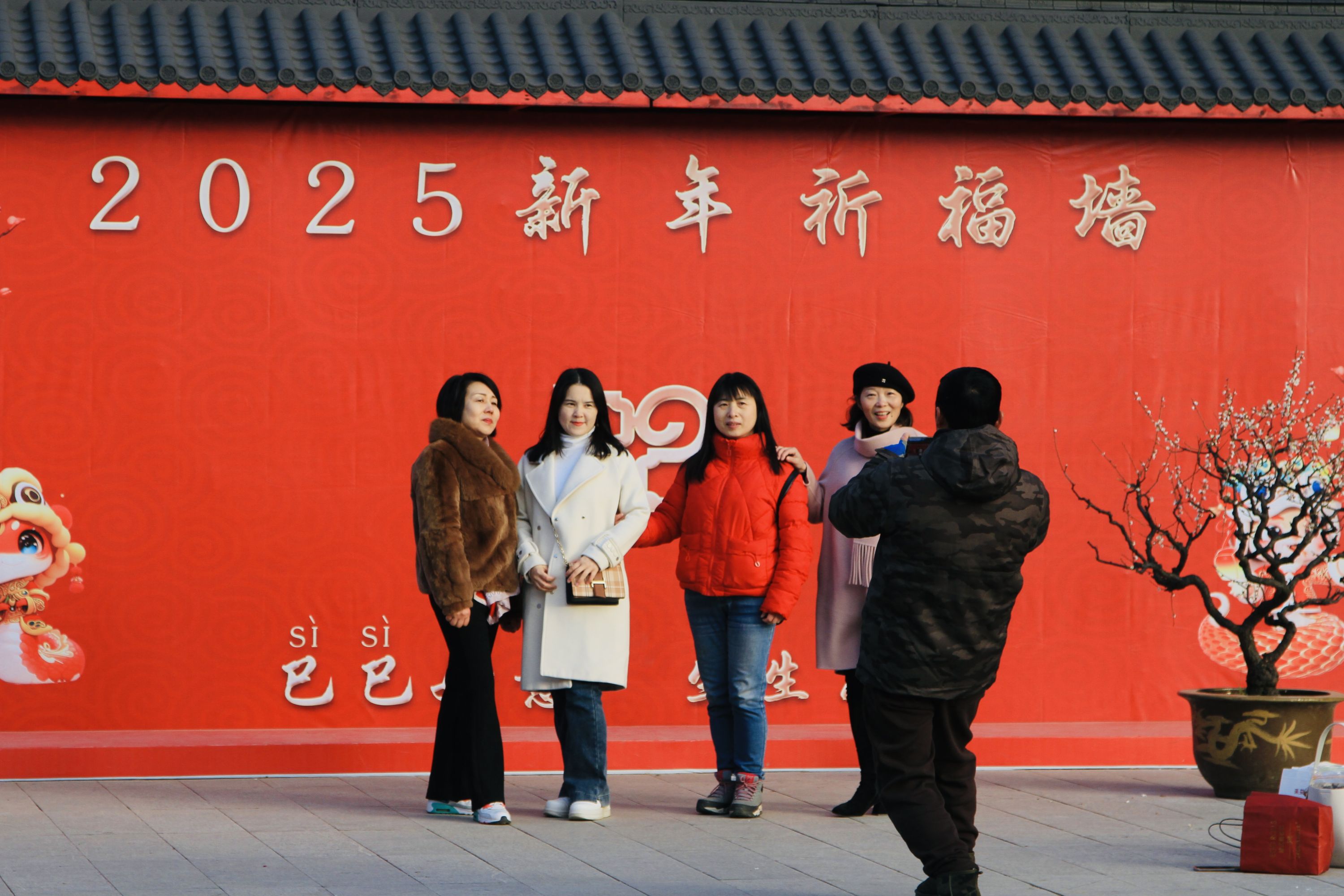 东湖梅园新年打卡墙前,游客们合影留念。赵丽摄