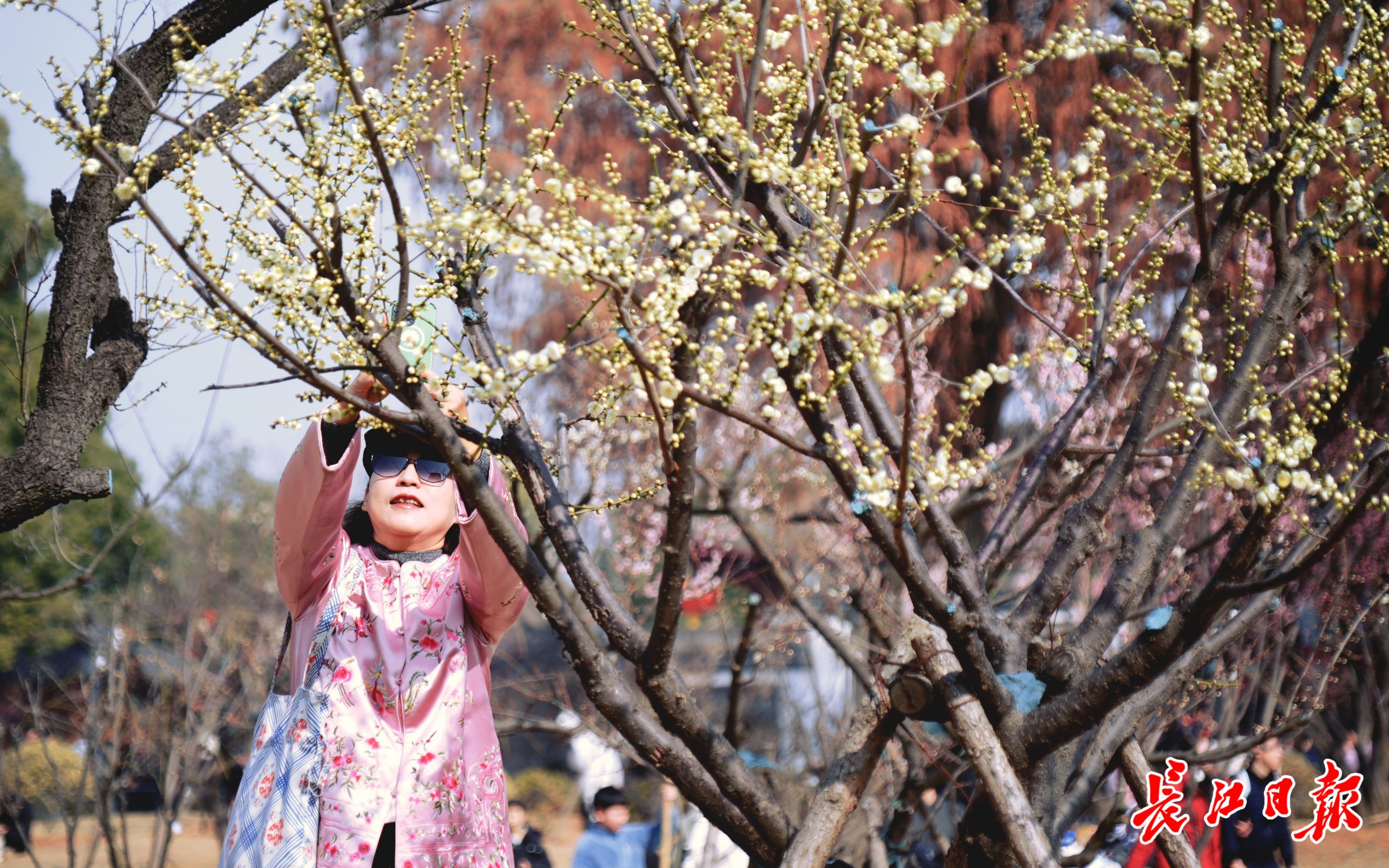 上午11时,当记者到达东湖梅园时,梅园入口已排起长队。家住武昌的摄影爱好者周先生背着三脚架匆匆入园:“我每年都来东湖拍梅,就属今年花开得最齐整,连老桩上的骨朵都爆满了!”园内小径上,粉瓣如霞的白梅、绛红似火的朱砂梅、嫩黄透绿的绿萼梅交织成片,暗香随风浮动,引得顾客纷纷驻足观赏。