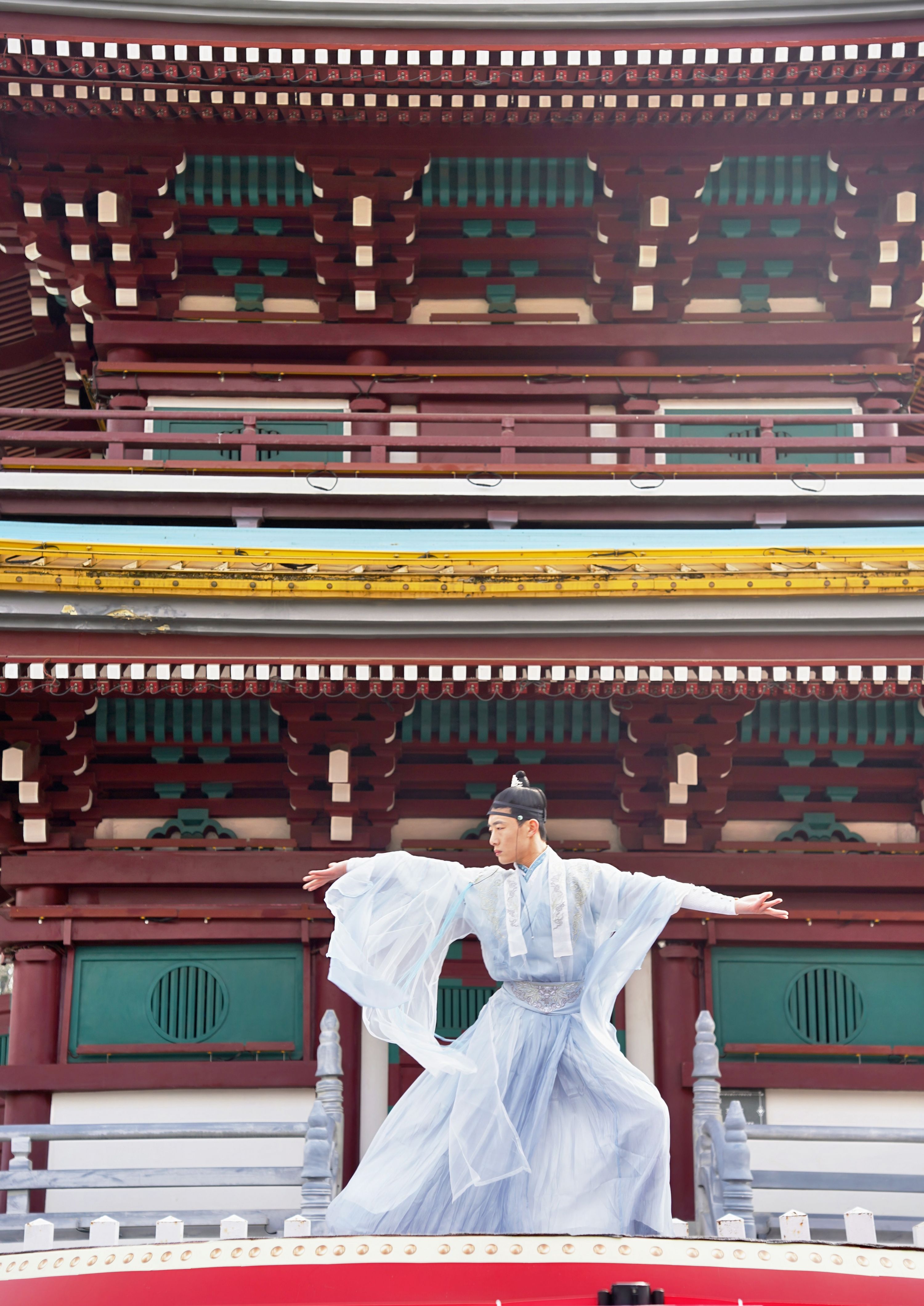 五重塔处,舞者正在大鼓上舞蹈。张媛 摄