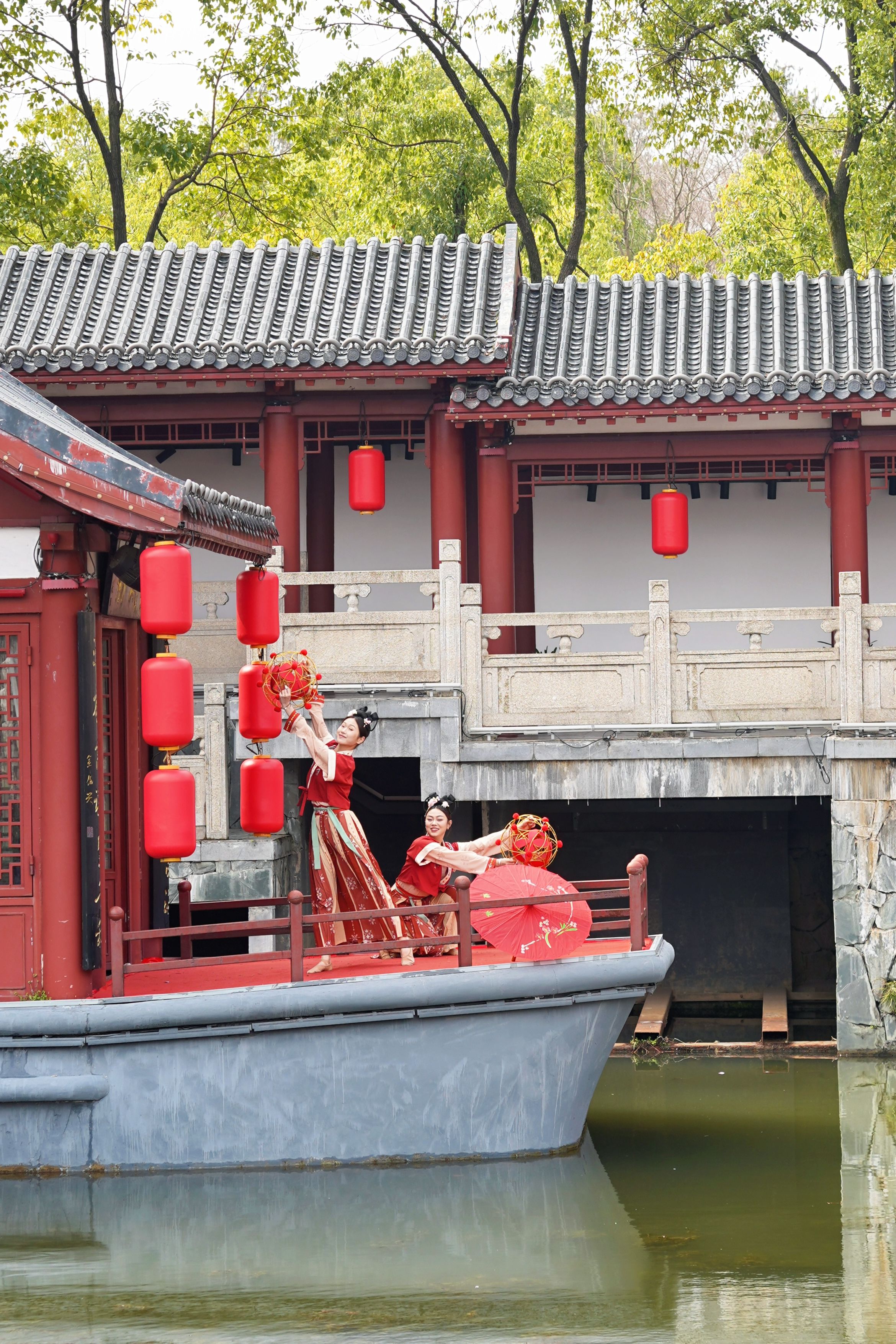 流水潺潺,舞姿翩翩,刚入东湖樱花园,正门旁红墙碧瓦的曲院樱艳乐曲声就传入耳畔。两位古风少女在画舫上正俏皮舞动着红金色镂空花球,与内湖中悠闲游动的锦鲤、正在迎风飘动的枝叶相映成趣,颇有意境。此地将在开园期间为游客带来《绮梦舞月》及《弦梦古音》两大演出,在彩排过程中,景区编导不断指导演员调整着表情管理和演出细节,力求达到最佳演出效果,“15度微笑弧度或爽朗露齿笑,眼神要与游客互动。”“站位再调整一下,保证大部分角度都能无遮挡看到演出。”