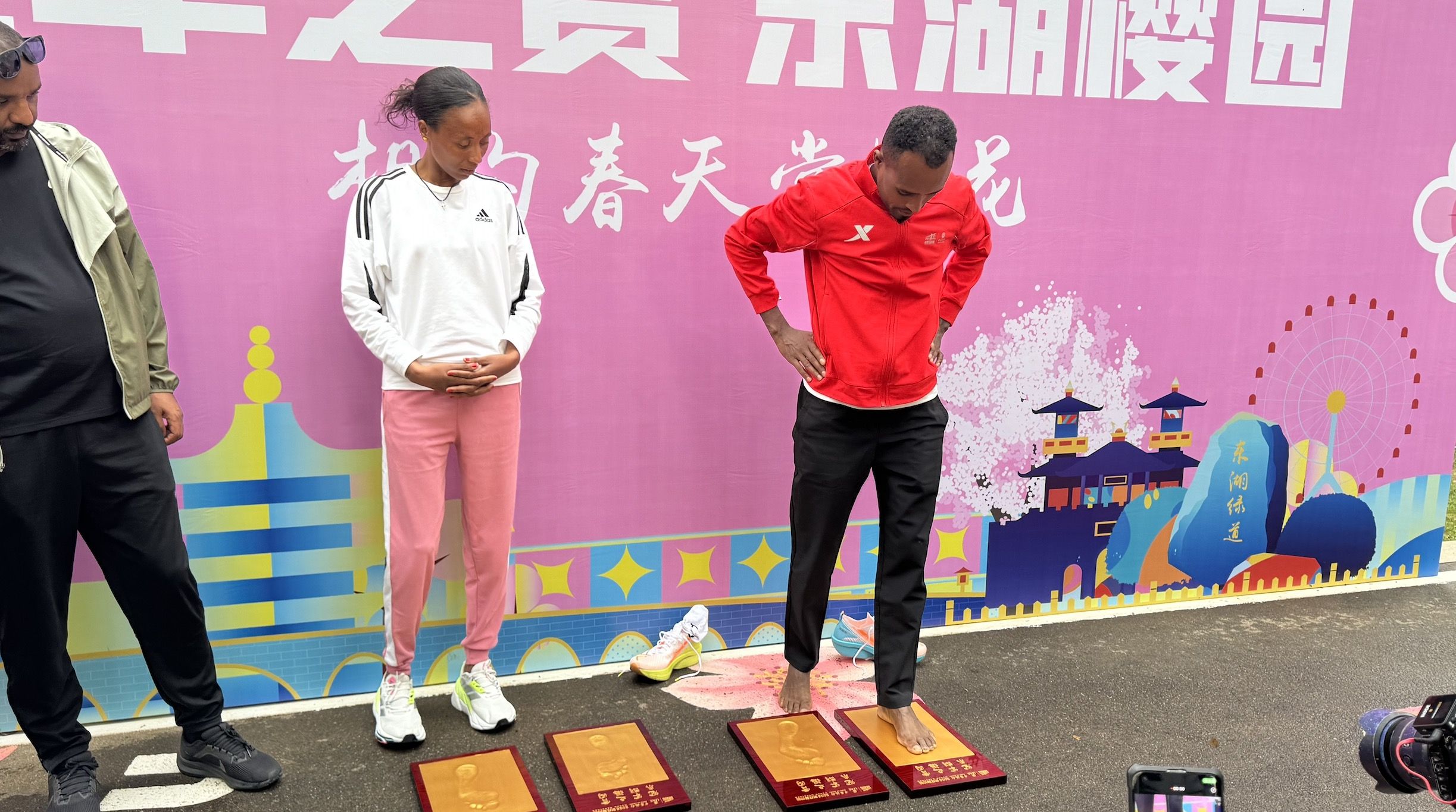 来自埃塞俄比亚的阿塞法·门格斯图·内格沃和古特尼·肖恩·伊马纳分别获得全马男、女子组的冠军,进入樱园后他们在樱花树下留下冠军脚印,它记录着42公里征程的每一寸土地,也刻下了他们与武汉的联结。