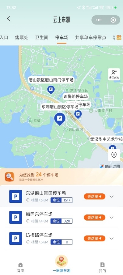 游客可在小程序实时查询景区周边停车场位置。