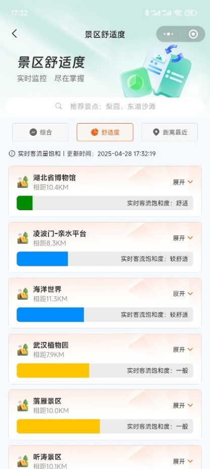 五一想来东湖游玩,却不知道景区交通情况、人流量等的游客,如今可通过“云上东湖”小程序一键获知景区实况。基于实时人流量与游客分布数据,小程序会在“实时景点推荐”板块标注各大景区的实时客流饱和度,智能分析游玩舒适程度,为游客推荐舒适游览路线,减少排队等待。游客还可通过小程序直接预订景区门票,提前规划行程。