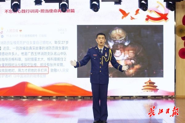 来自区消防救援大队的桂文俊正在分享感人事迹。 记者薛灵毓 摄