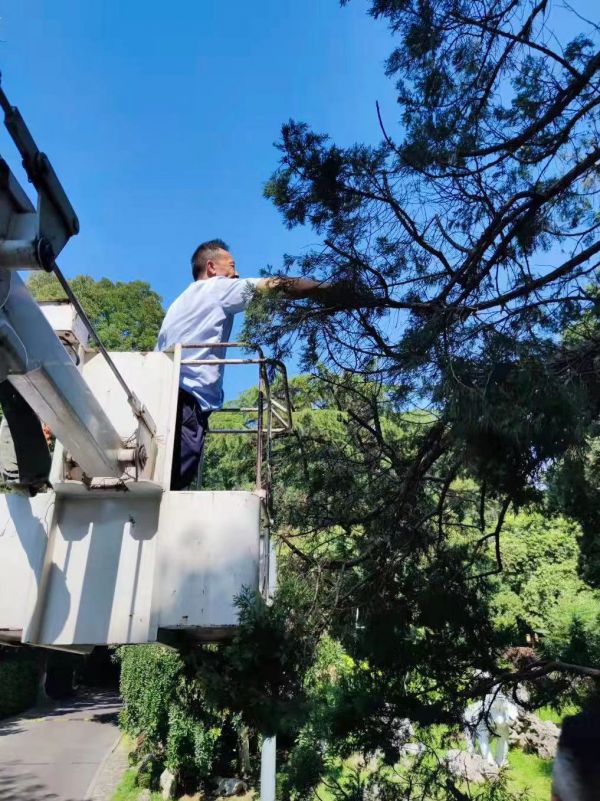 东湖听涛景区园林工作者在高温下修剪树枝。