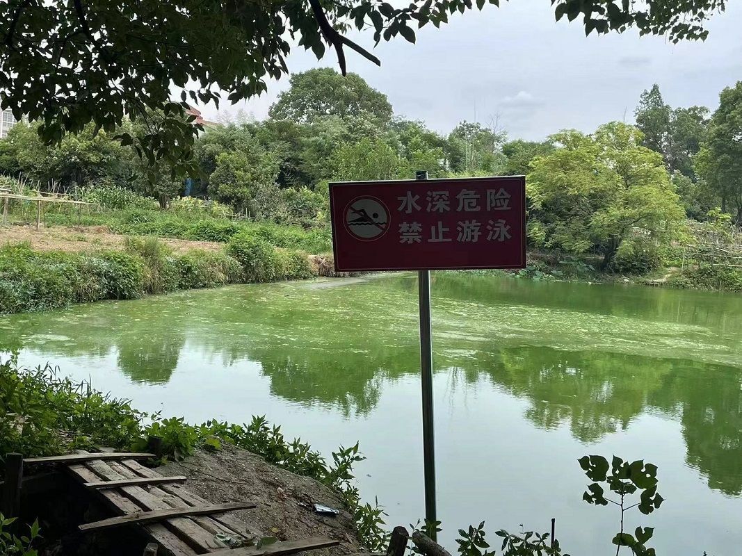 “水深危险,禁止游泳”,在植物园路树下咖啡旁边的河塘边,社区工作人员正冒着高温,拿着铲子,在岸边易落水点竖起警示牌。“我们每周都会对辖区内的山塘、河道沿线进行巡查,这几个月在巡查中我们新竖了3个警示牌,提醒大家注意安全。”桥梁社区工作人员付彬说道。