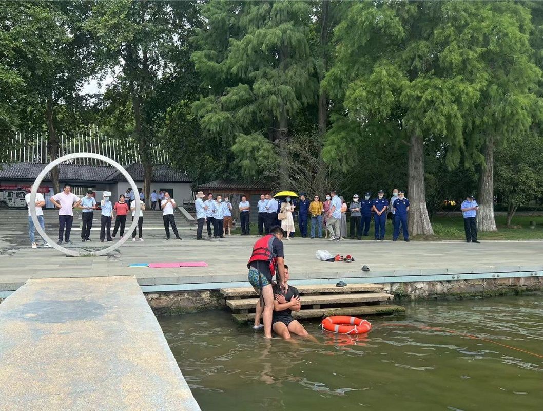 “快!有人溺水了!”在听涛泳场,武汉市政安护生消防集团的张丹教官、东湖风景区消防大队胡品警官与东湖沙滩浴场张晨曦救生教练现场还原溺水营救。从模拟溺水、现场赴救到心肺复苏、拨打120,整个演练过程一气呵成。