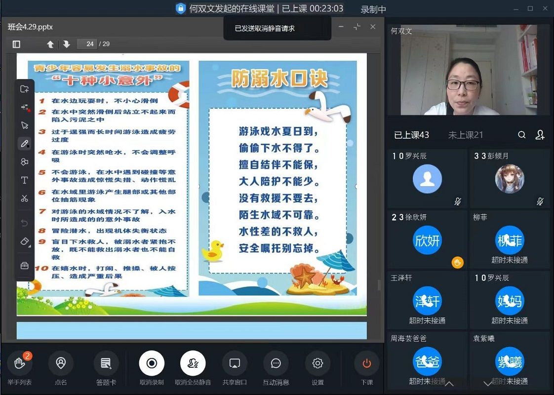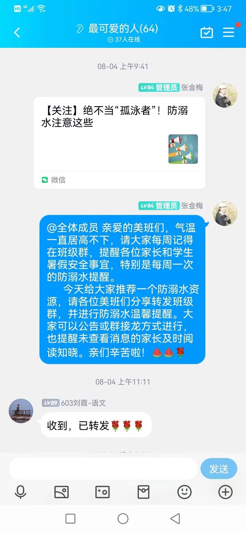 来自华侨城小学44个班级的班主任们,作为组织家长们在群内接龙反馈夏季玩水安全的信息的发起人,被大家亲切地称为“神威龙主”。自今年5月起,暑期玩水安全知识普及就已经成为该校每位孩子的“必修课”,十余次大小安全课堂在线上、线下传播,暑假更是加大力度反复提醒,“学校放假了,安全不‘放假’!”