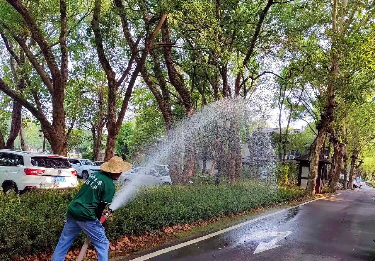 除了“水袋子”“打吊瓶”,园林工人们在园区针对草坪、花卉、灌木、乔木、新老树苗的不同特点,分别采取了水车浇水、自动喷淋、水袋滴灌以及360度高压水炮等“补水神器”,让植物“自由喝水”。“对喜阴植物及新种小苗加盖遮荫网,对种植在绿地中的树木树穴松土,对高大的树使用水雾喷洒,滋润叶面,因地制宜保证苗木顺利度过高温。”郭陆军介绍道。
