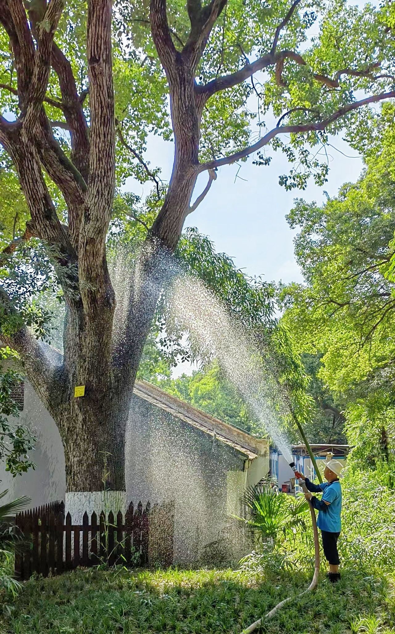 “这两棵百年古香樟树是重点看护对象,浇水除害都马虎不得。近日天热,香樟古树又高大,人工喷洒难,好在这两天下了几场雨,雨水也能让叶面保持湿润,为它降降温。”东湖听涛景区行吟阁片区的园林养护负责人郭陆军说道。