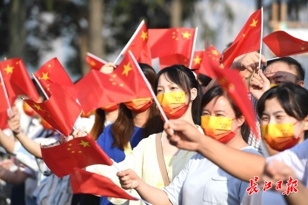 市民在《我和我的祖国》歌声中挥舞国旗。长江日报记者高勇 摄