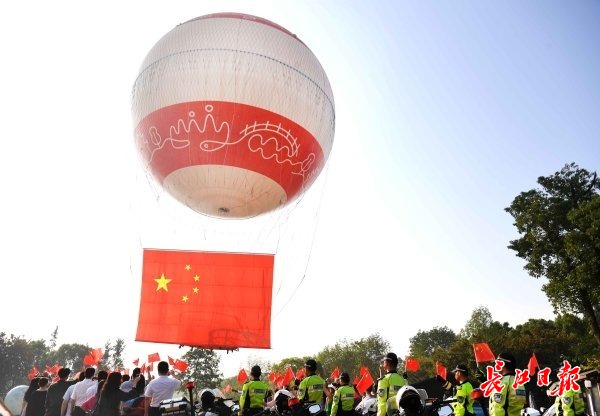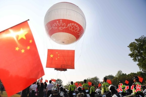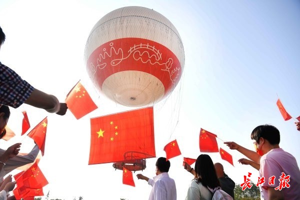 在 《我和我的祖国》歌声中,市民挥舞国旗,氦气球带着巨幅国旗升起。 长江日报记者高勇 摄