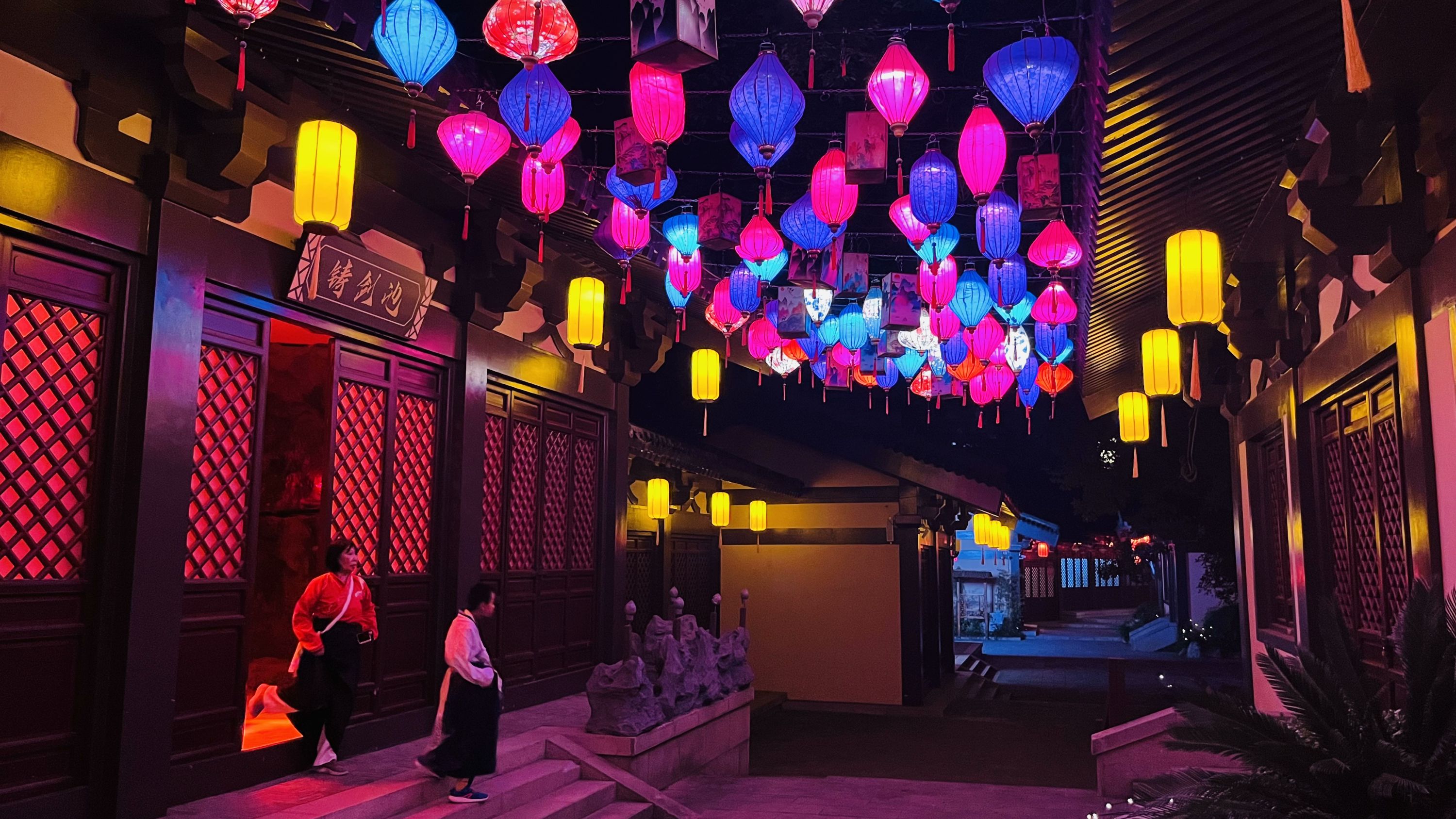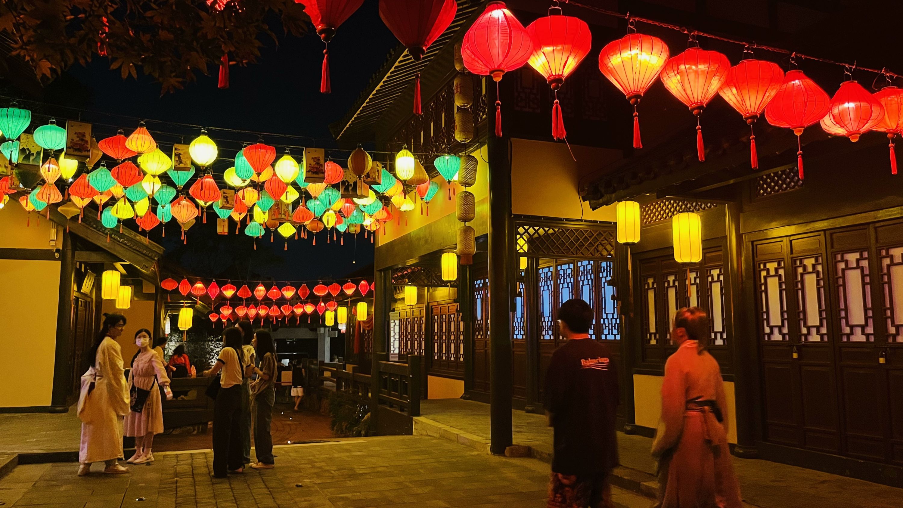 国庆期间,古风市集、非遗技艺、国漫手作,以及妙趣横生的皮影戏、宋代著名茶百戏都被搬进剧游现场。“朋友是剧本杀爱好者,今天特地带他来体验下进阶版。夜晚的氛围感更好,沿街的红灯笼一亮,一秒穿越到古代。”游客刘赛说。