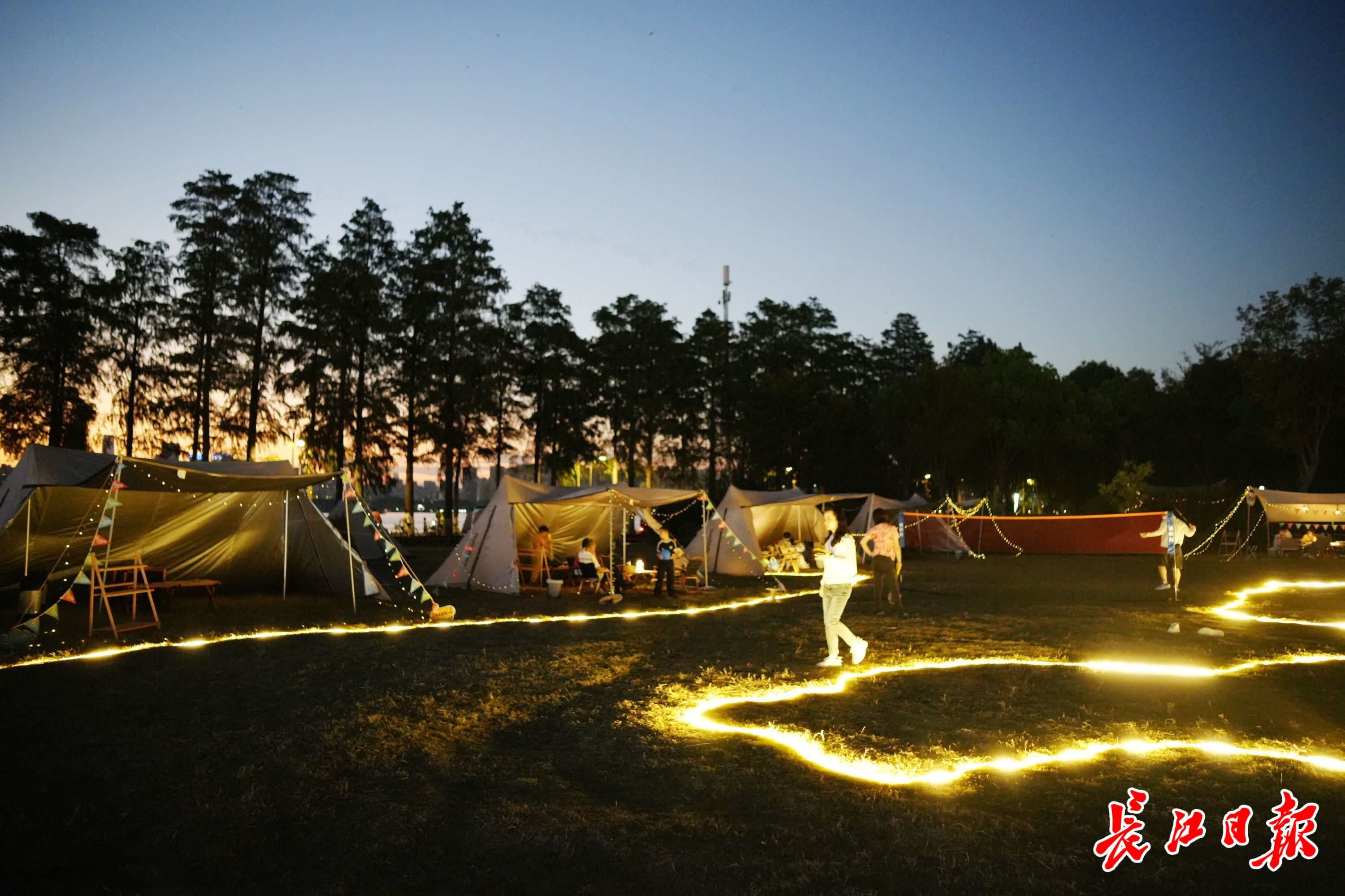 傍晚时分,东湖沙滩升起袅袅炊烟,帐篷上的星星灯璀璨绚烂,有的游客在踩沙戏水,抓螃蟹、喂锦鲤;有的则躺在透明的星空屋内欣赏夜色。“太惊艳了,夜晚的东湖更浪漫!”家住汉口的王女士一家玩完水上游戏,便返回帐篷烧烤休憩。