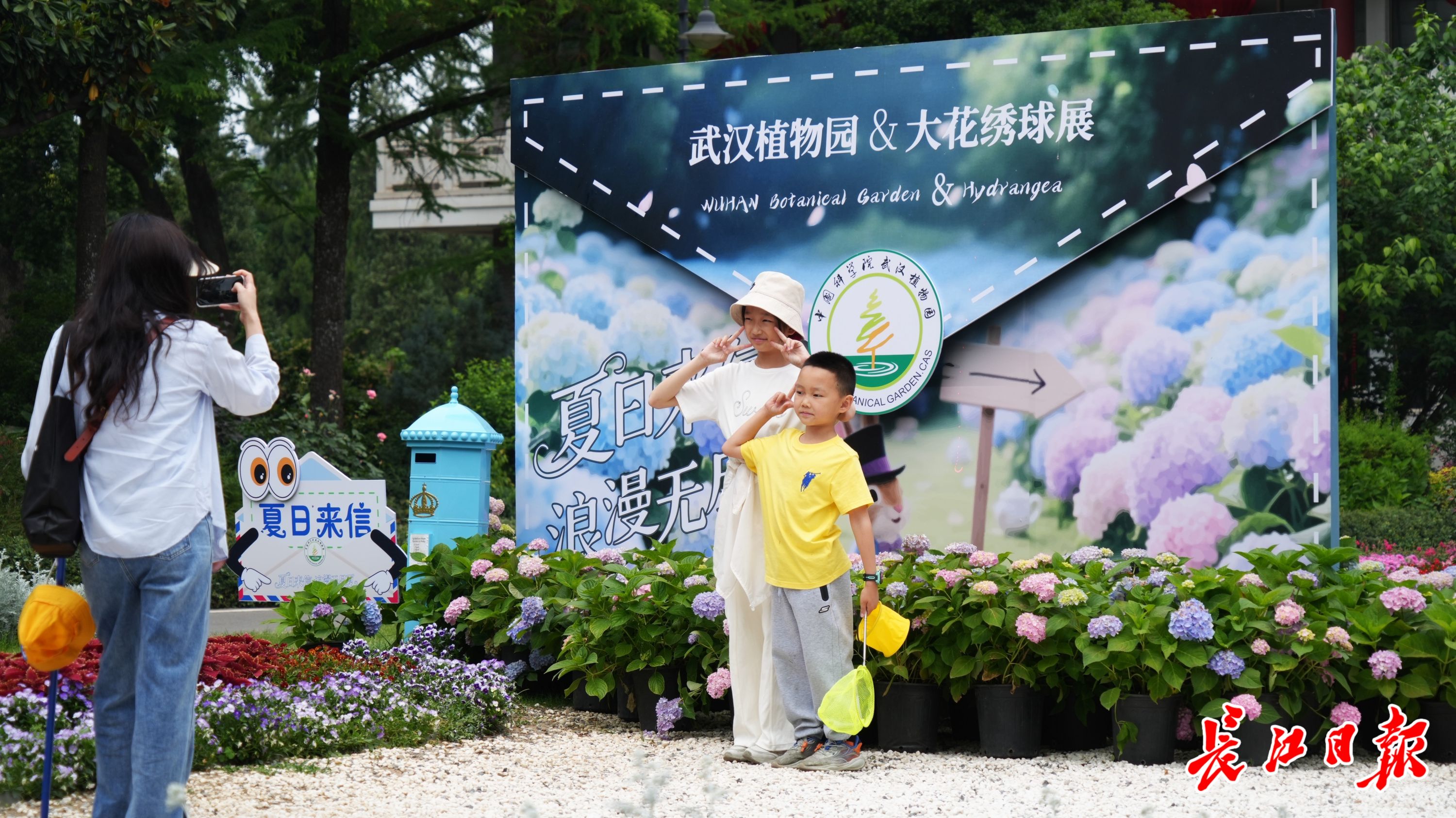 5月4日清晨,武汉植物园内已人头攒动。入口处,姹紫嫣红的花海簇拥着巨型“夏日来信”绣球信笺,十余名年轻人正排队等待拍照。步入园内,绣球、月季、睡莲、鸢尾绽放,营造诗意浪漫,挪步绣球主题展区,各种卡通花车、蓝色信箱、邮票画框等打卡装置隐匿其中,仿佛步入斑斓的童话小镇。