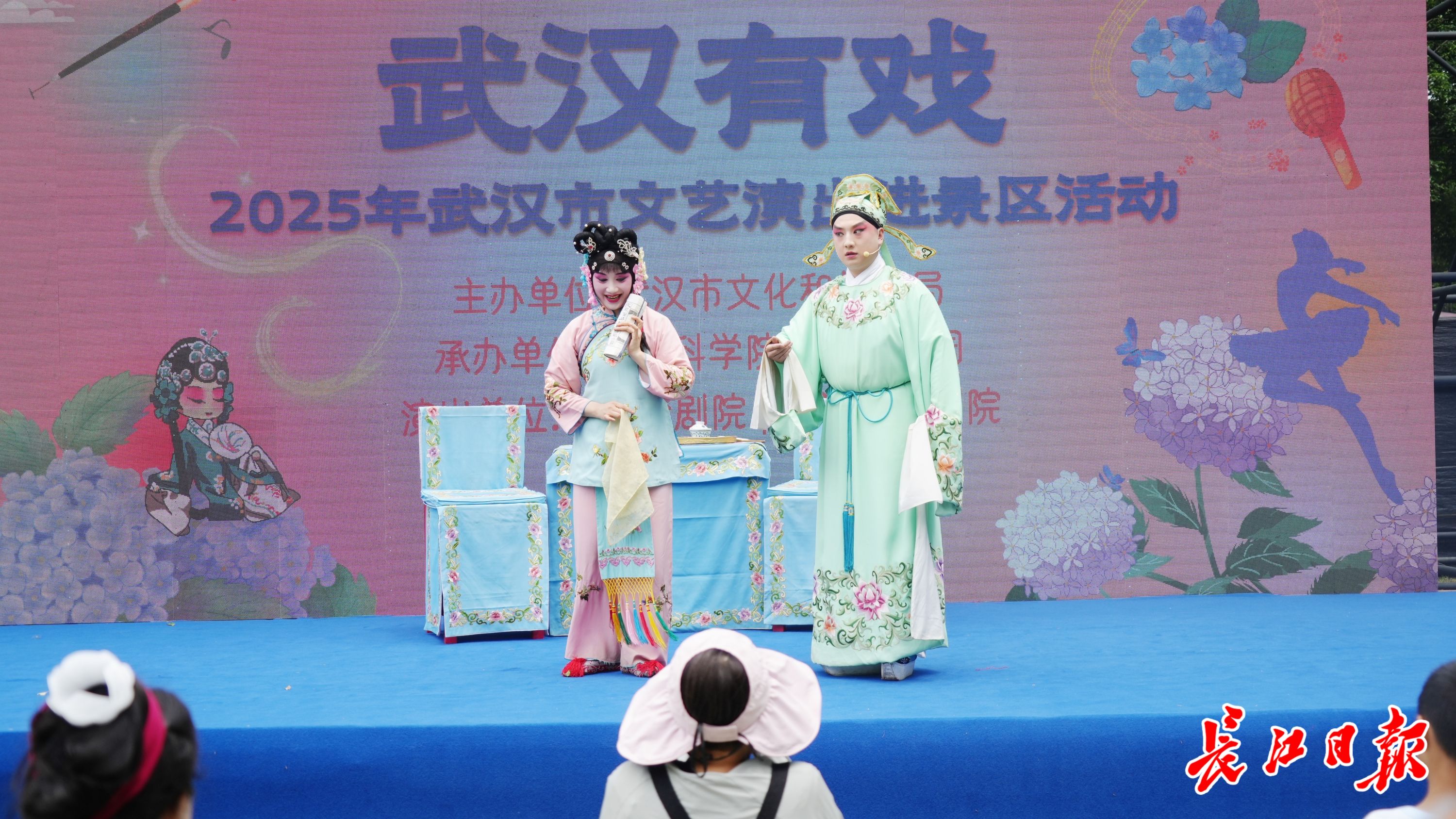楚剧走进武汉植物园。上午10点半,在武汉植物园中心草坪,楚剧演员们身着戏服,水袖轻扬,唱腔婉转,一招一式尽显功底,赢得了观众阵阵掌声。许多游客在赏花之余,近距离感受传统戏曲的魅力。